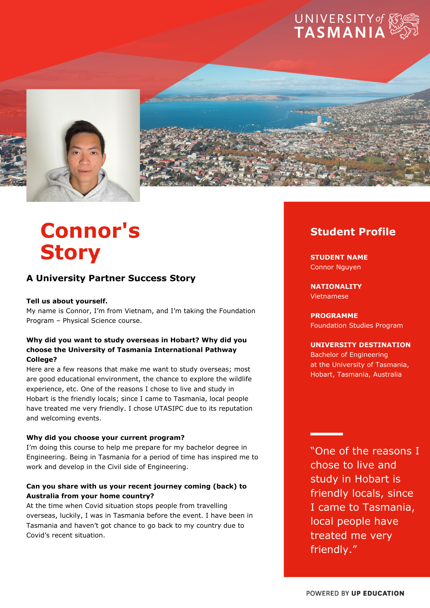 University of Tasmania International Pathway College Testimonial – Connor